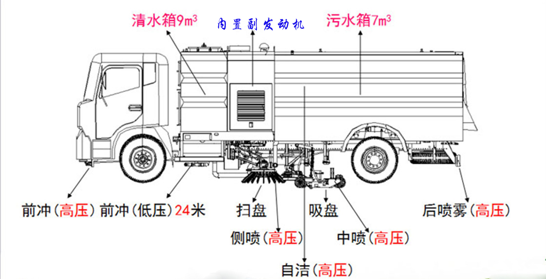 中置2掃盤、吸嘴、三洋馬達、德國原裝進口高壓水泵(前沖、側噴、中噴、后噴霧、側沖洗車水槍、垃圾箱自潔裝置)、萬向高壓路沿清洗、低壓泵前沖、不銹鋼水箱、垃圾箱;不銹鋼高壓管路、施耐德控制開關、美國傳感器、尾部LED箭頭燈、機油、垃圾箱、水箱均帶防溢或低水位報警裝置;倒車及洗掃狀態駕駛室內監視器、18m高壓沖洗卷盤、最大洗掃寬度3.5m;高壓沖洗高度≥21m。
