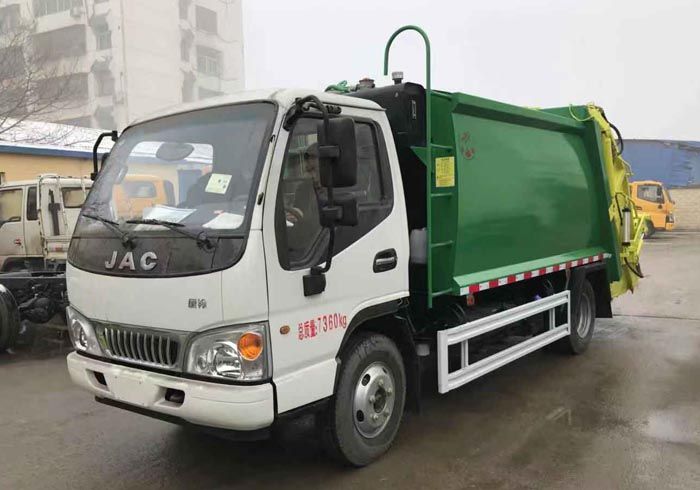 江淮康鈴壓縮垃圾車廂體弧形設計,6方箱體邊4mm,底4mm,采用國內著明品牌油缸,高密度高壓油管,多路閥和油泵,帶掛桶或小落地斗翻轉,帶PLC,選裝掛桶翻轉機構或三角斗,可選擇金屬漆。